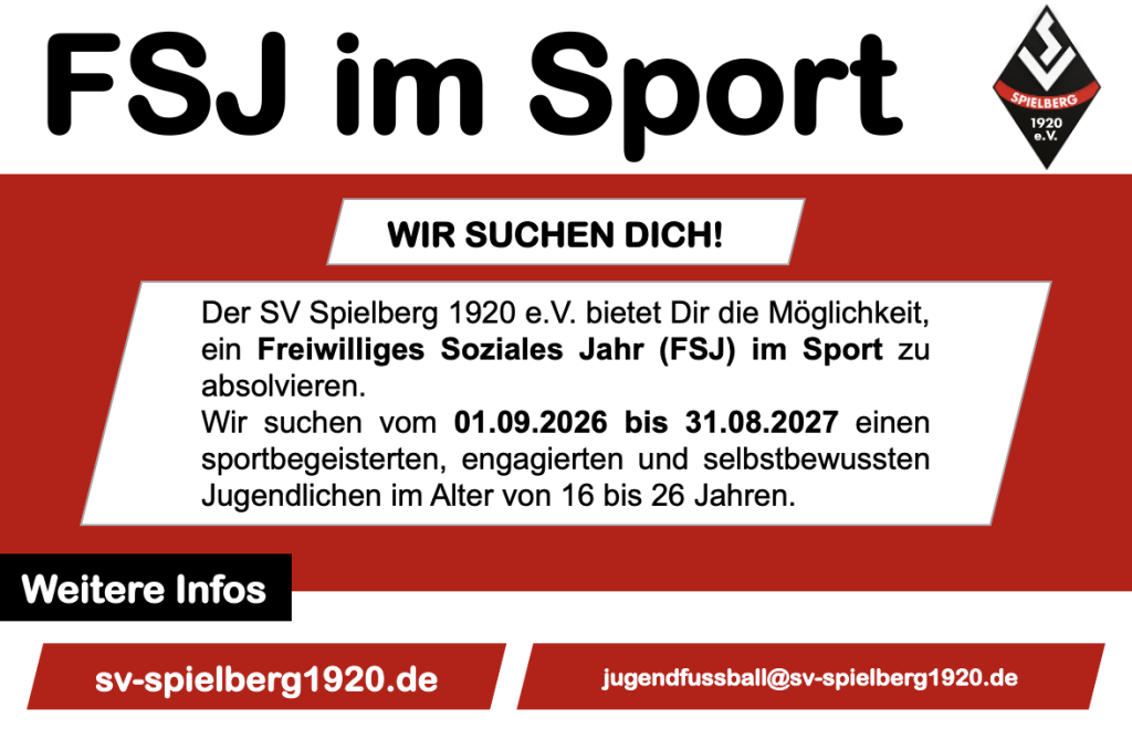 Der SV Spielberg sucht zum 01. September 2026 einen FSJler (m/w/d) im Sport.
